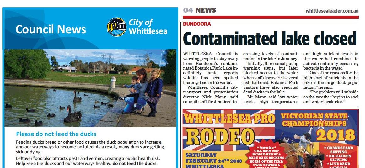 File:Whittlesea Leader Contaminated lake closed Duck 13 Feb 2018.jpg