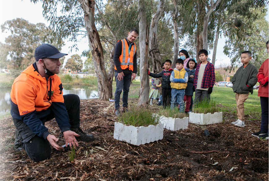 - July 2021 – Community Planting Day with the Whittlesea Youth Environment Action Group and residents from the community (6th July 2021) with NatureLinks. Riparian vegetation included Kangaroo grass (Themeda triandra), Slender Wallaby grass (Rytidosperma racemosum), Purplesheath Tussock Grass, Sword Tussock Grass (Poa ensiformis) and Common Sedge (Carex tereticaulis).