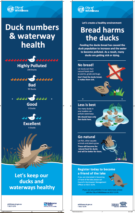 - The aim of the sign was to provide the public education on duck feeding and also provide information on appropriate duck populations for Botanica Park lake.