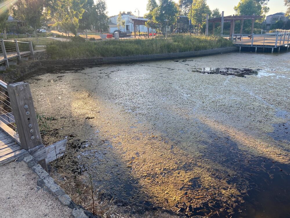 Photo showing the buildup of filamentous algae in Botanica Park lake southern pond before removal 13 Jan 2022.