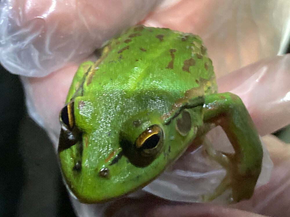 Photo of the threatened Growling Grass frog captured during a wildlife audit 14 Dec 2021. These frogs were once very common all throughout the municipality. It is believed that urban development, pollution, introduced animals, loss of habitat and the chytrid fungus (Batrachochytrium dendrobatidis) have caused local populations to crash.