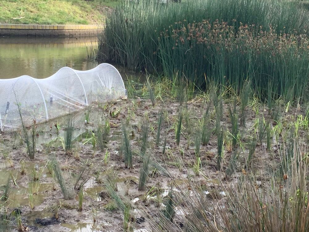 Some new vegetation protected by netting because ducks will eat the young seedlings. Other aquatic plants do not require netting - 13 March 2020