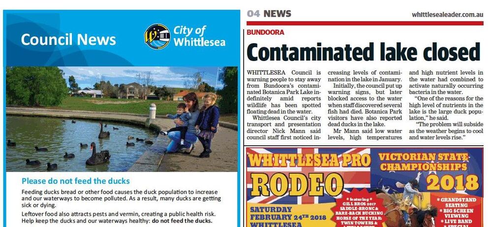 - During the period of Avian botulism at the lake there was communication to the public about the environmental damage caused by feeding bread to ducks.