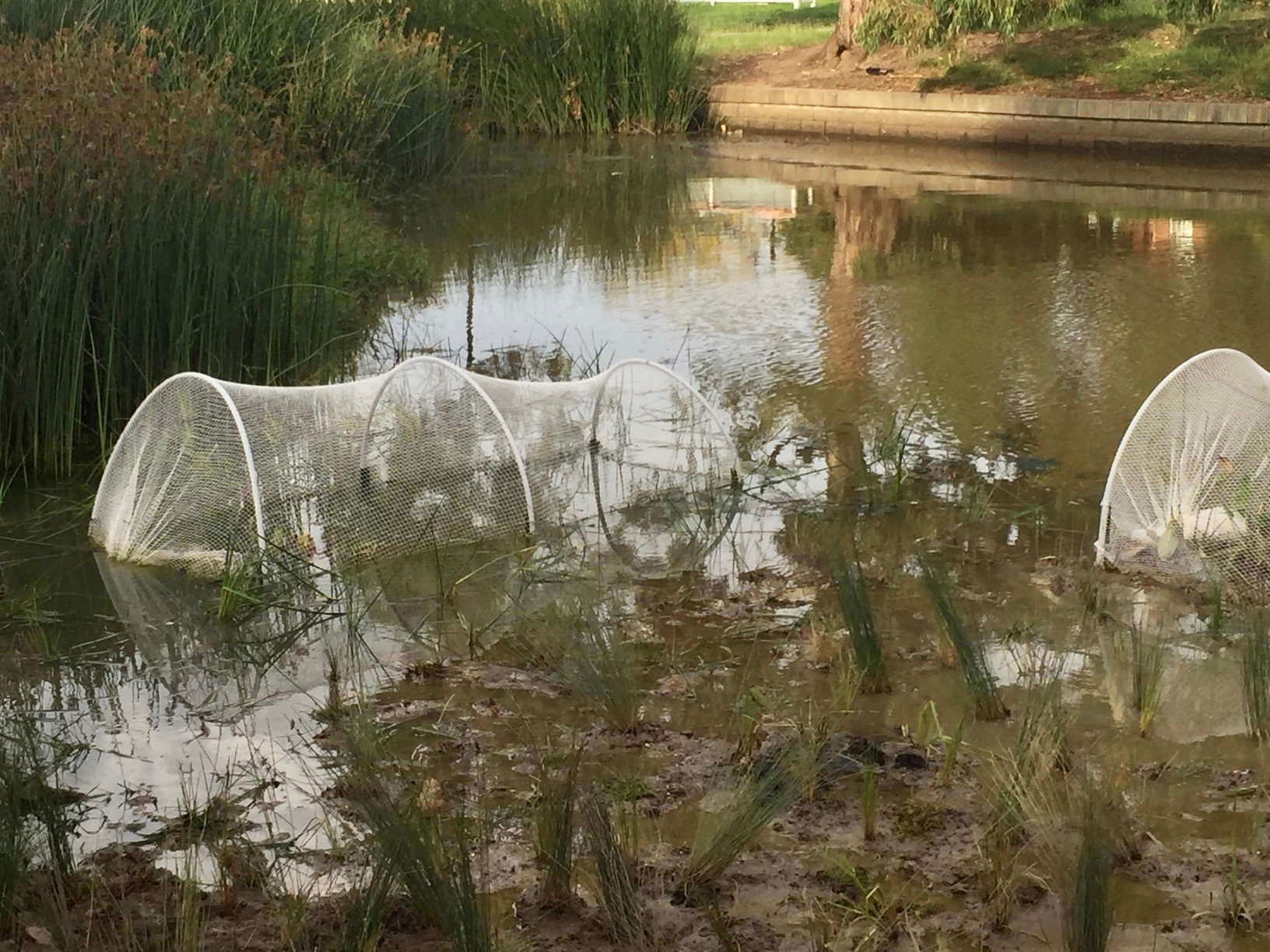 Some new vegetation protected by netting because ducks will eat the young seedlings. Other aquatic plants do not require netting - 13 March 2020