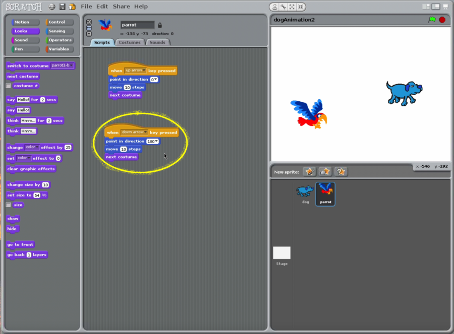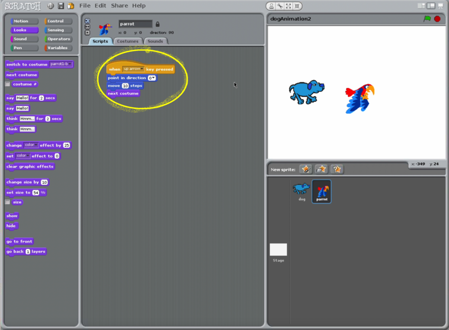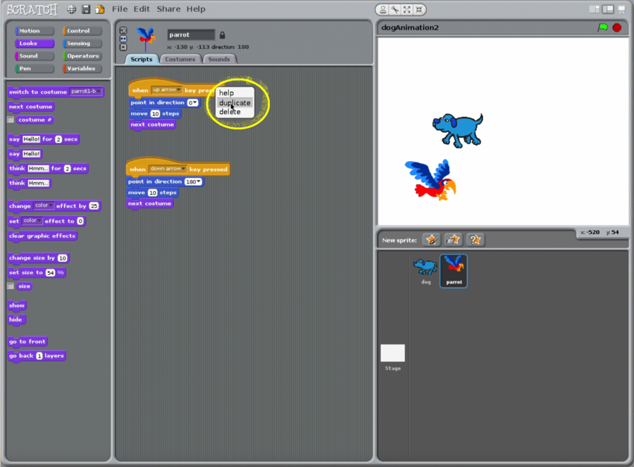 - https://www.dropbox.com/s/ssy27ik76zeairt/dogAndParrotAnimation.sb?dl=0