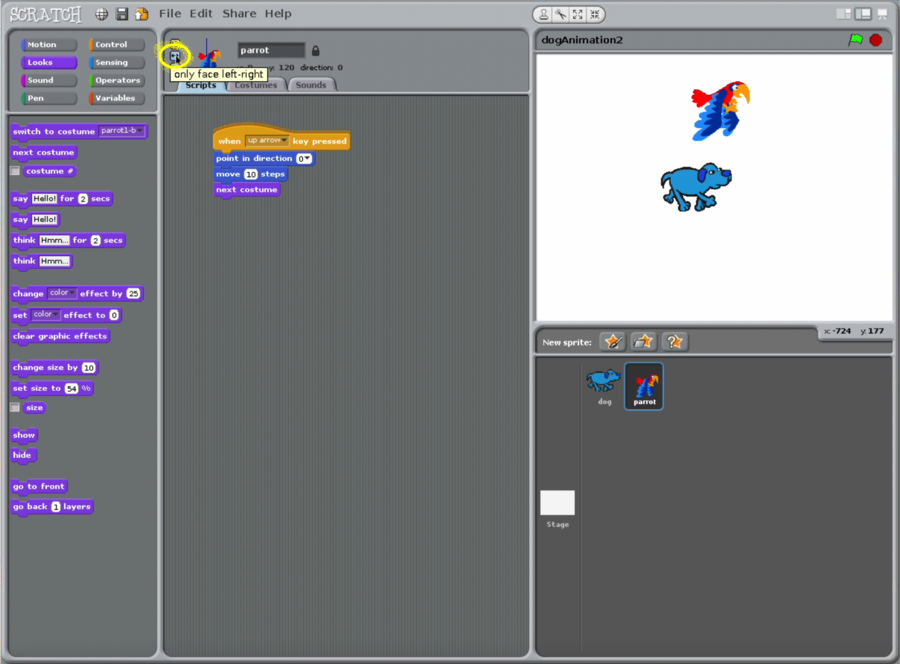 - Select the middle button next to the sprite to make the parrot only face left-right