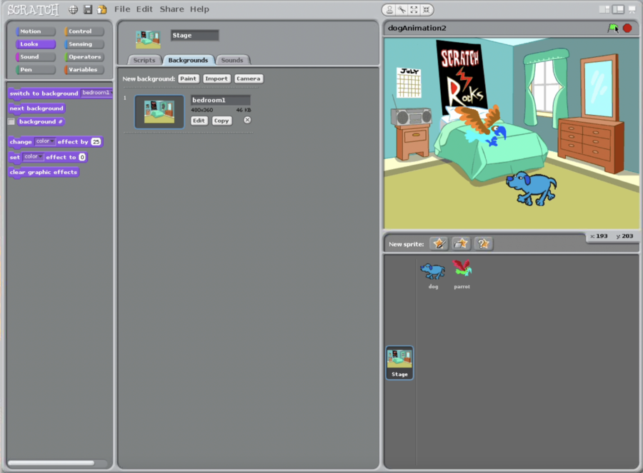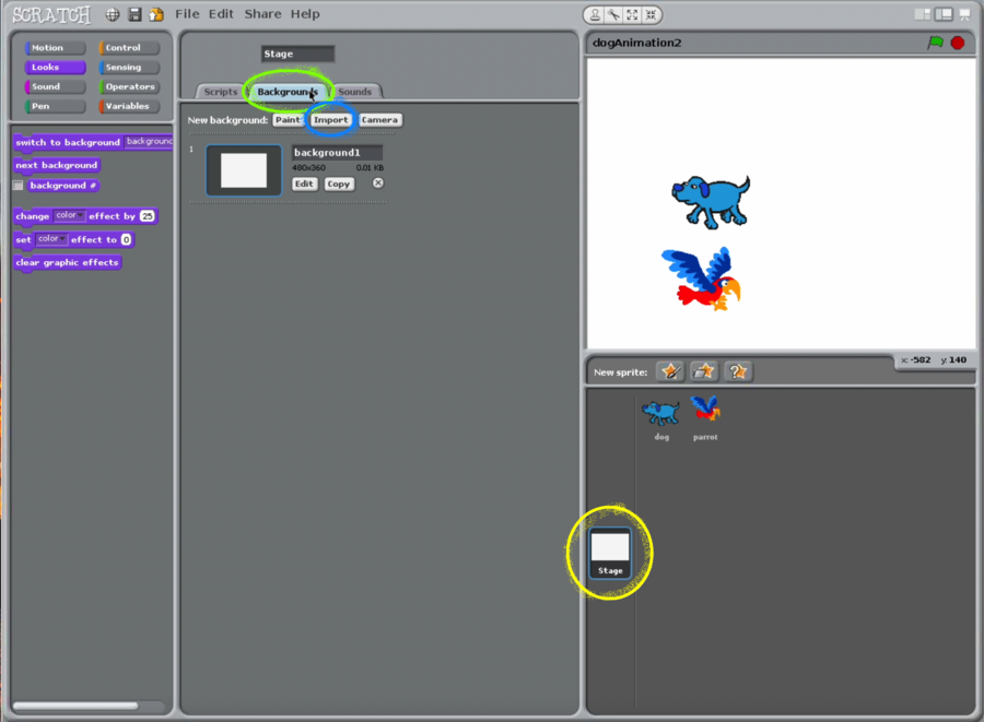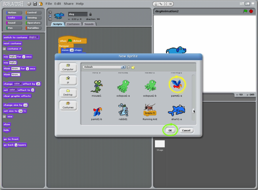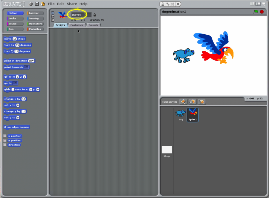 - Download Scratch (v1.4) file dogAndParrotAnimation.sb using the link below.