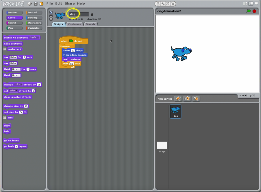 - Change the default name of the sprite to dog
