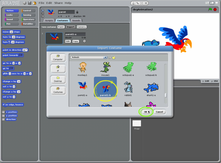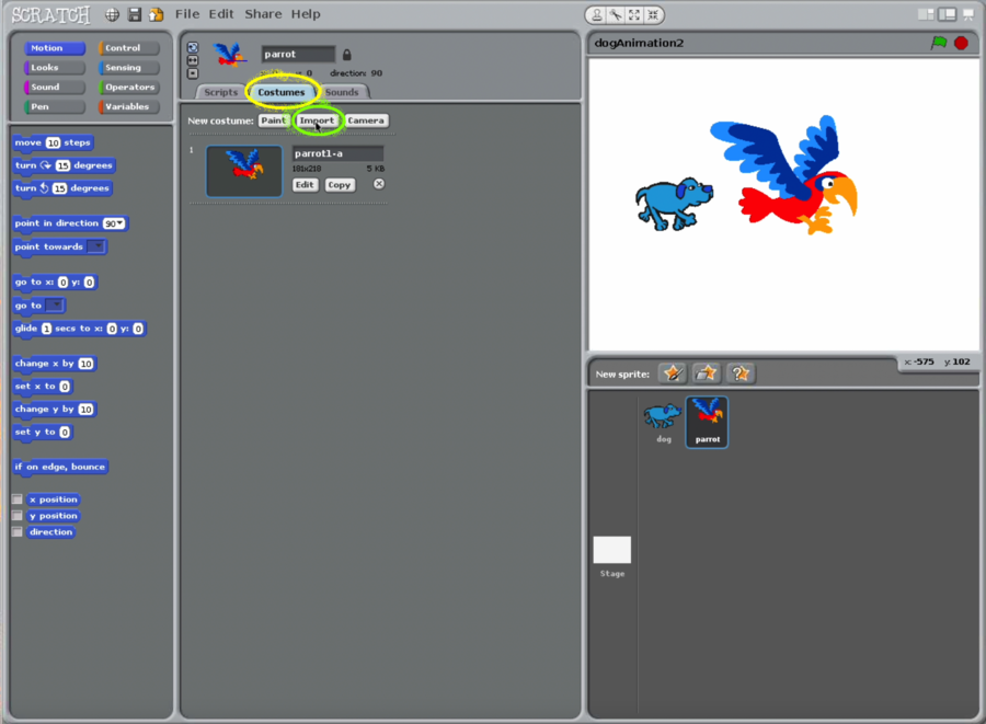 - Import a second parrot costume so that we can do animation.